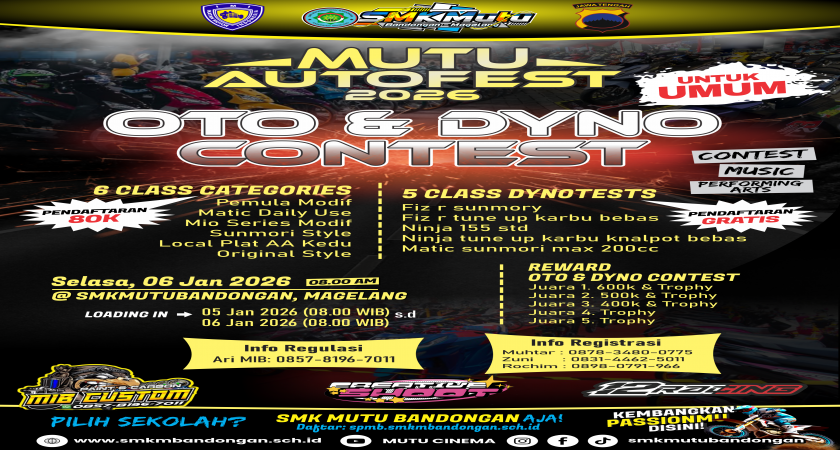 Magelang – Dunia otomotif kembali bergelora di awal tahun 2026. MUTU Autofest 2026 – Oto & Dyno Contest resmi digelar di SMK MUTU Bandongan, Kabupaten Magelang, Selasa (6/1/2026). Event ini menjadi wadah adu gaya, adu spesifikasi, hingga adu tenaga bagi para pecinta motor dari berbagai kalangan.